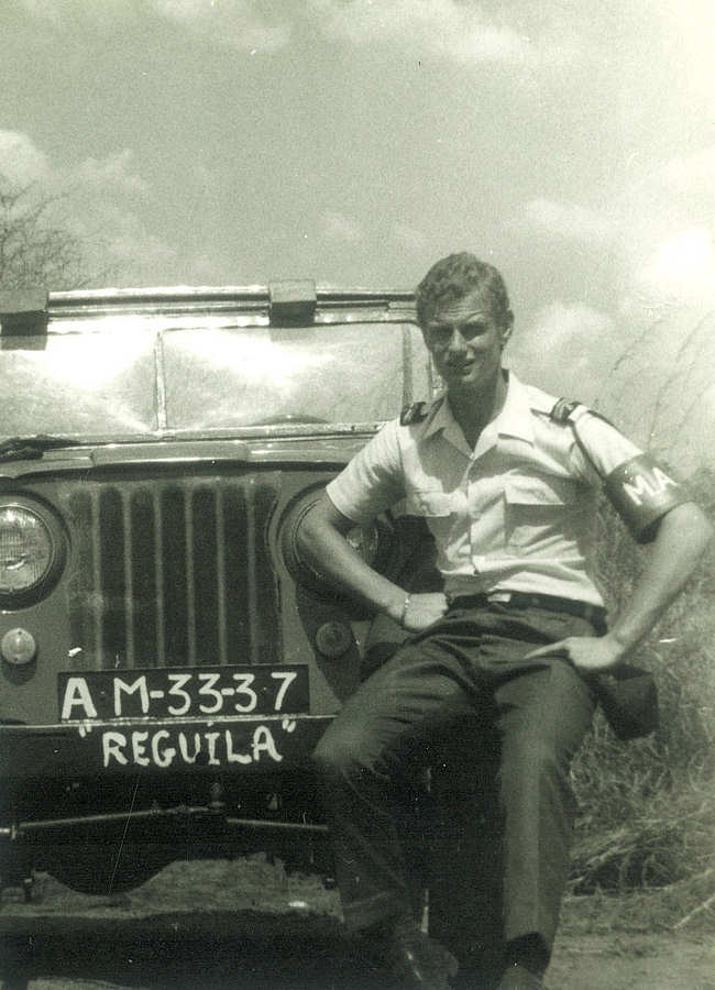Nos arredores do Aeródromo Base nº 6. Este jeep foi especialmente cedido para a caça. Embora já abatido, fomos canibalizando outros em pior estado. Foi tarefa em que estive empenhado a 100% e que me deu um enorme gozo. Ccomo tal, para ficar para a posteridade, pedi que me tirassem a fotografia sentado no pára-choques da viatura.