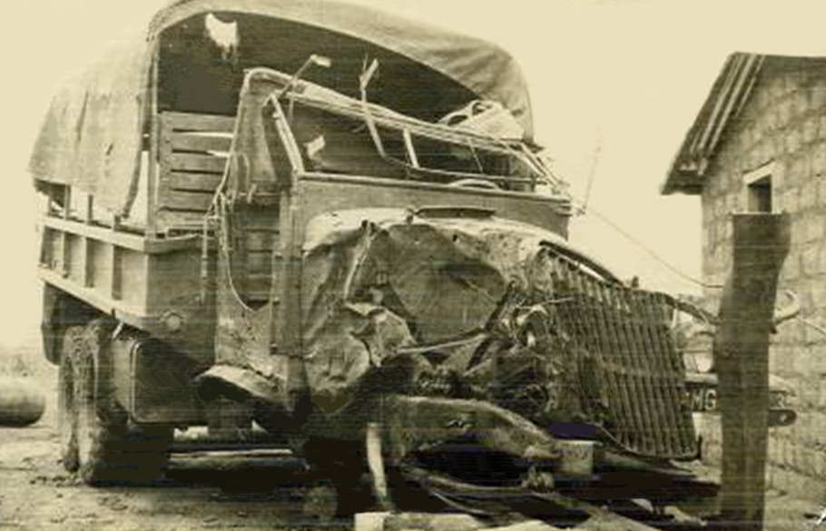Tinha pisado a mina com a roda da frente do lado direito. Embora forte, toda aquela área tinha sido destruída. Parte da carga que vinha à frente ficou inutilizada. A maior desgraça foi a cerveja, que vinha à frente. Mais de metade das garrafas partiram-se.