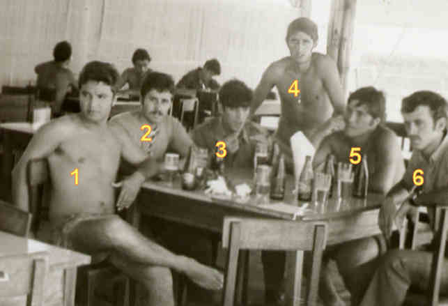 Grupo da Companhia de Caçadores 3437 do Batalhão 3855 a petiscar e a berber umas Cucas no bar "Brinca na Areia". Da esquerda para a direita: ???; ???, ??? e ???.