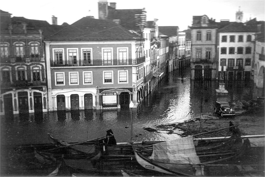 Aspecto das cheias em Aveiro, no ano de 1938, vendo-se na imagem o Canal Central e parte da Praça do Comércio (actual Praça Melo Freitas).