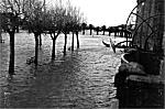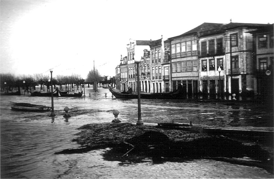 Aspecto das cheias em Aveiro, no ano de 1938, vendo-se na imagem o Canal Central e parte do Rossio. Em 1º plano, a rua de acesso à Barra e Costa Nova.