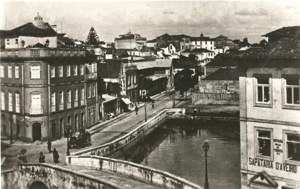 Parte central da cidade, vendo-se o resto do aqueduto e, à direita, o moinho de marés, onde veio a erguer-se o edifício onde funcionou a Escola Industrial Fernando Cadeira e a Capitania do Porto de Aveiro. Nota: esta imagem é a reprodução fotográfica de um desenho, que está assinado, embora isso não se veja nesta reprodução. Ficheiro: Aveir_048.jpg - 89 KB