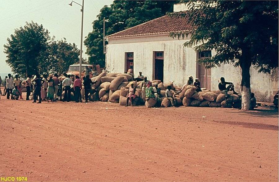 Aspecto da rua principal de Brito Godins, povoação situada na picada entre Marimba e Malanje. Em frente à casa da direita, vêm-se as sacas com algodão, a principal produção desta região.