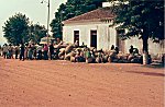 Aspecto da rua principal de Brito Godins, povoação situada na picada entre Marimba e Malanje, vendo-se a população em fila com as sacas com algodão para pesagem e venda.