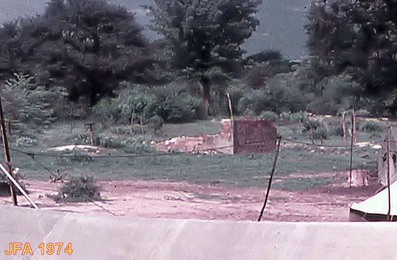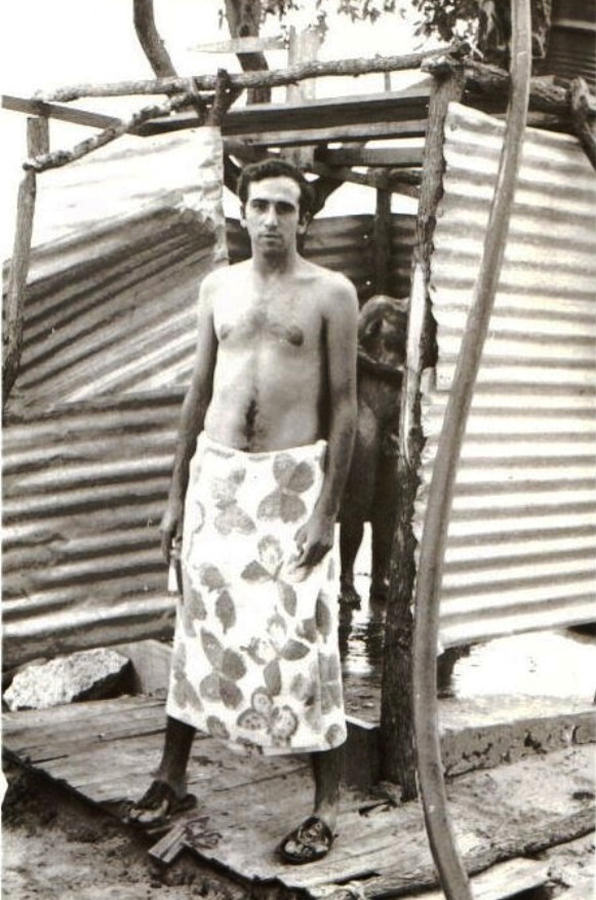 O Autor numa  foto para enviar à família, junto da torre de suporte do depósito de água. Ao fundo as casernas da CCaç.3387.