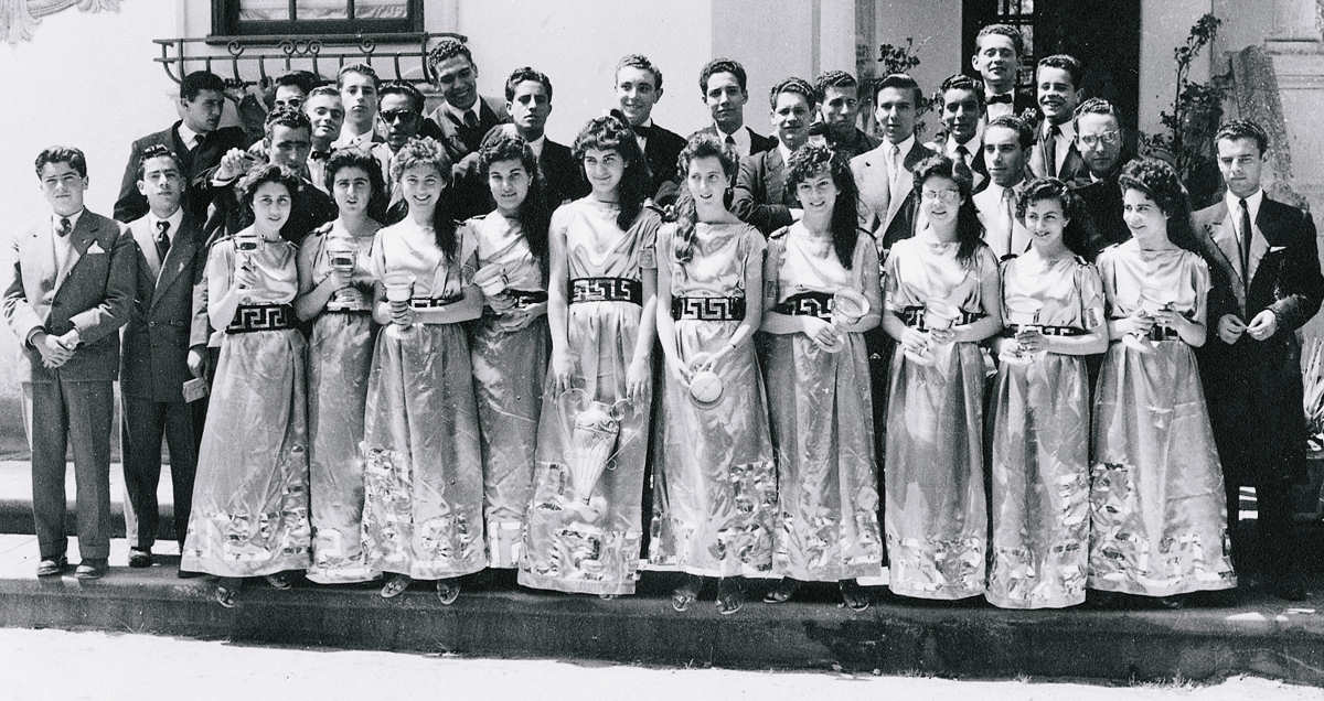 9 e 10 - Récita realizada em 6 de Maio. Participantes da Dança da Primavera. Fotografia tirada no Parque, sobre a ponte de pau. Foto de Diamantino Dias   11 e 12 - Alunos finalistas do ano lectivo de 1954/55. Foto junto à Casa de Chá do Parque. À frente, as meninas que participaram na dança grega da récita realizada em 6 de Maio de 1955. Foto de Diamantino Dias NOMES