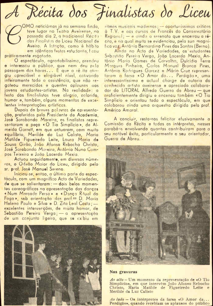 Reprodução do recorte da notícia surgida no jornal aveirense "Litoral" na semana do espectáculo.