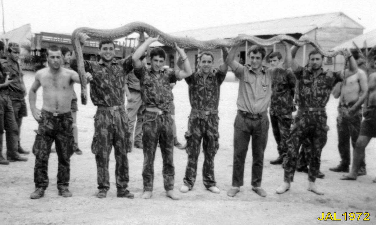 Dois elementos da Companhia de Caçadores 3412 em 1972, com uma enorme jibóia: ??? e ???.