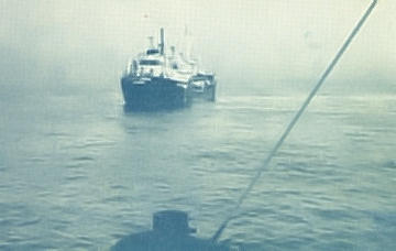 Ao aproximarmo-nos do «SANTO ANDRÉ», estabeleceram-se os primeiros contactos pela fonia, que serviram para troca de cumprimentos. Na ponte, avistámos os primeiros conhecimentos. O piloto entrou para bordo e o rebocador começou a manobrar para a passagem do cabo de reboque. Pelo nosso lado, ansiávamos por passar para bordo do «SANTO ANDRÉ», mas o nosso dever de «reporter» mantinha-nos no «FOZ DO VOUGA».