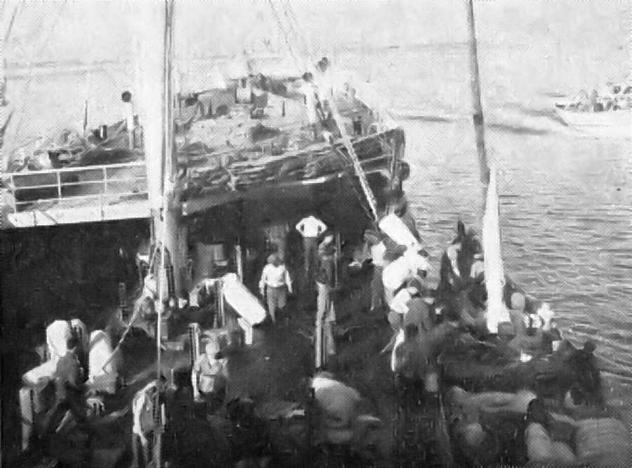 No convés ia grande azáfama na passagem das bagagens para o barco que as transportaria. Notava-se uma ansiedade natural em todos os rostos pela chegada a terra, junto dos entes queridos. Como a maré tardava, a nossa equipa de reportagem teve de regressar antes do navio, na lancha que rebocava o barco das bagagens e às 9 horas, logo que chegámos a terra, demos por terminada a reportagem. A nossa pequena aventura tinha terminado.