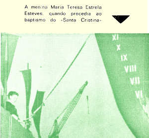 Serviu de madrinha para o «Santa Cristina» a menina Maria Teresa Estrela Esteves, filha do Sr. Dr. Manuel Esteves, que baptizou o navio com a simbólica garrafa de espumante, depois de lhe ter sido lançada a bênção pelo rev.º Bernardino Cristão, capelão da Base de S. Jacinto e prior da freguesia.