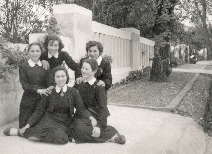 1 - Junto ao anexo (sala de Lavores Femininos), no pátio do Ext.º M. de Pombal - NOMES.   2 e 3 - Na estrada de Coimbra (actual Rua Prof. Mota Pinto), em 19 de Março de 1952. Foto 6x6 de Rosa.- NOMES.   4 - Abril de 1952 no Castelo de Pombal. Rosa Lagoa, Maria Emília Costa, Drª La Salette, Dr. Cró e Maria Luísa Nogueira.