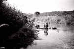 Abastecimento de água - O abastecimento de água potável ao aquartelamento de Quipedro era feito 2 vezes ao dia no Rio Nuno, um riacho que corria perto do aquartelamento, da maneira documentada pela fotografia: com baldes, barris e tambores.