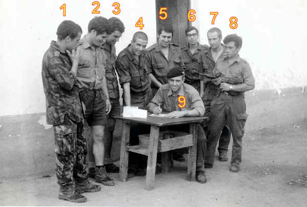 Elementos da C. Ca. 3387 em Quixico. Nomes: 1.Mário Silva (padeiro); 2.Miranda; 3.Carneiro; 4.Silvestre; 5.João; 6.Nossa Senhora Lopes (?!); 7.Fontinha; 8.Andrade; 9.Martingança.