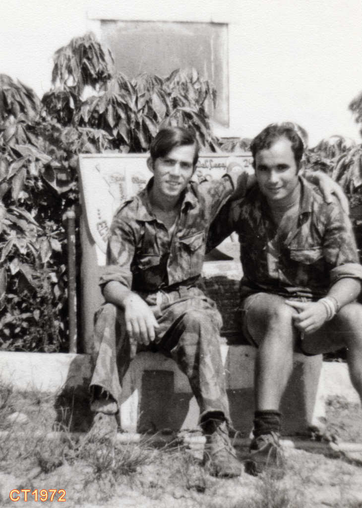Orlando e Luciano (Chorão) num momento de lazer, vendo-se, por detrás deles, da esquerda para a direita:  messe de sargentos, enfermaria e secretaria; a messe de oficiais; uma baliza para jogos de futebol.