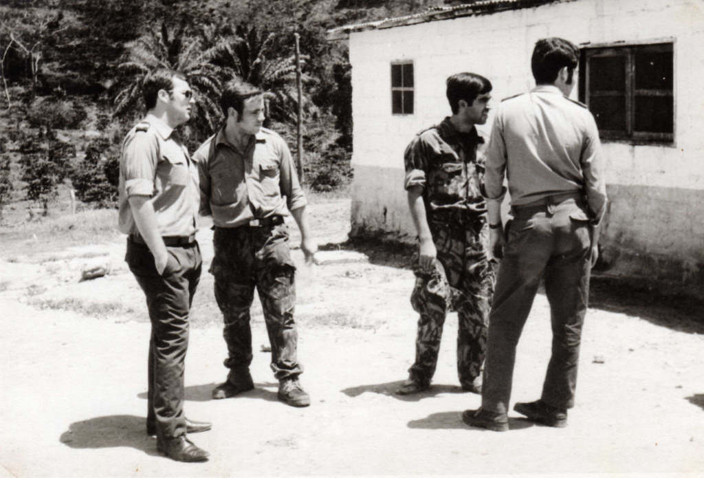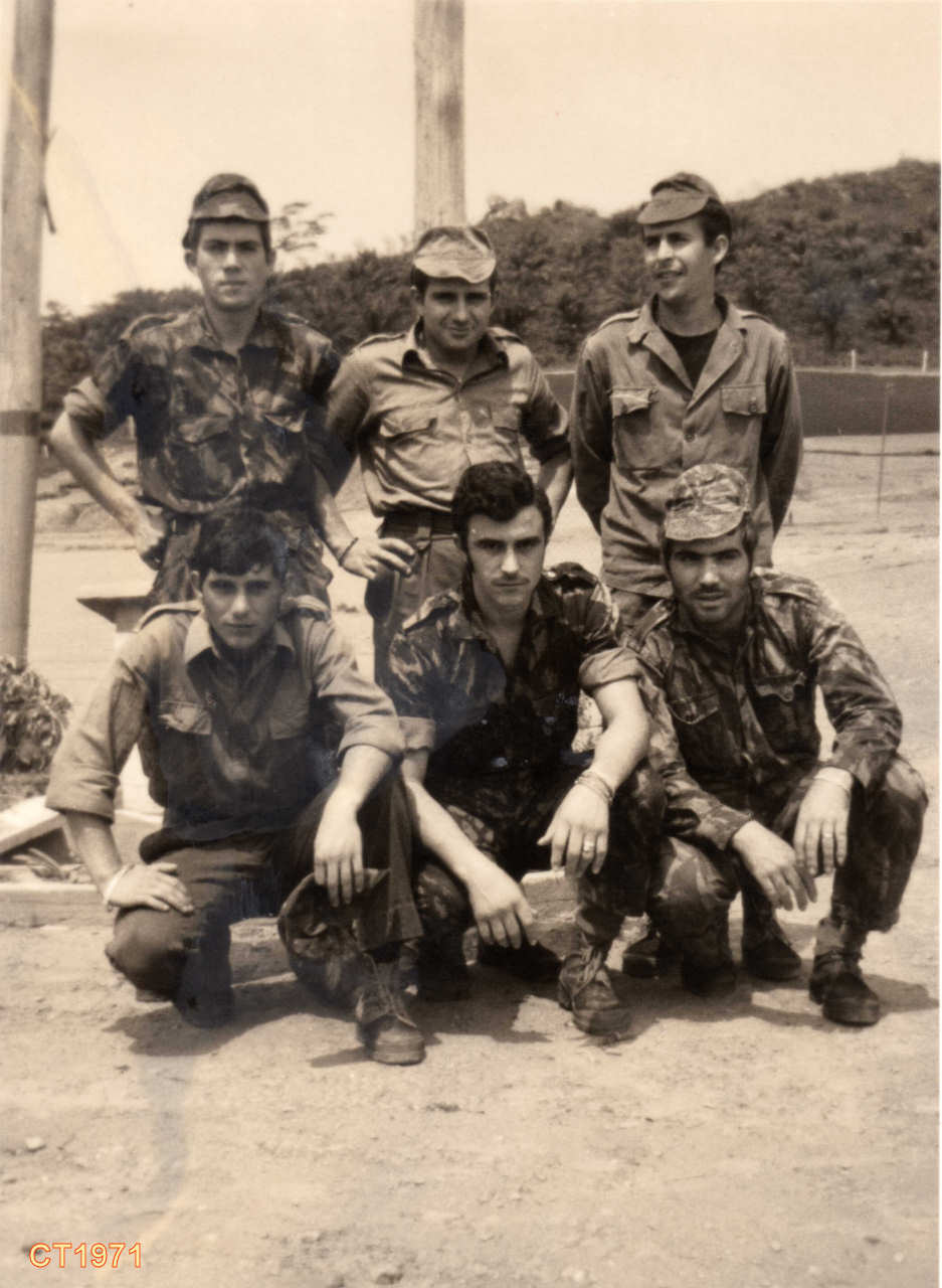 Apanhados distraídos junto à messe dos sargentos. Da esq. > dtª: furriel Godinho (furriel); Carlos Gaiolas; Fernandes (furriel); Vicente (corneteiro).