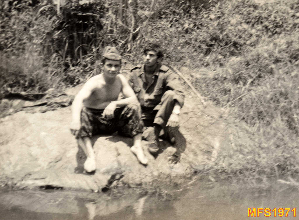 Fernando Andrade (cozinheiro) e Mário Silva (padeiro) na margem do Rio Onzo. Foi nesta altura que descobrimos que havia lagostins.