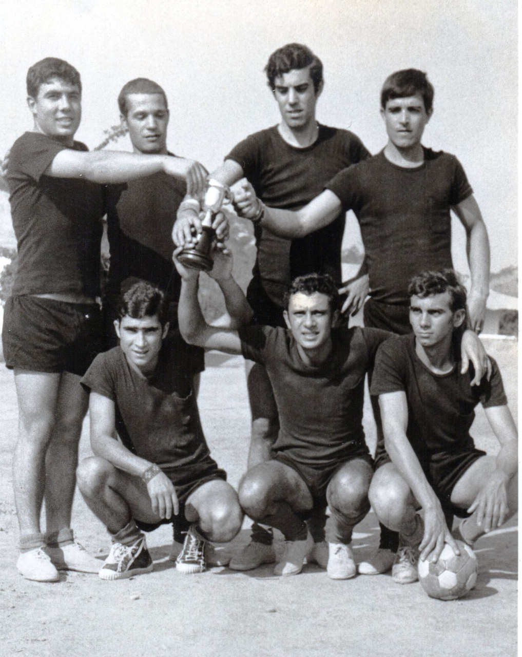 Final do torneio entre pelotões da Companhia de Caçadores 3387, em que a Formação ganhou o torneio. Da esquerda para a direita: em baixio: ?, ?, ? e ?. Em cima: ?, Mário Ferreira da Silva, ? e ?.