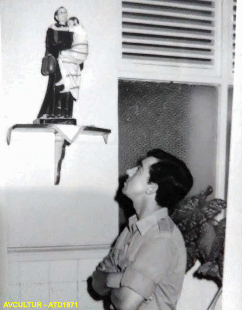 Albino Teixeira Dias, pertencente à Manutenção Militar, em 1971, em frente da imagem de Santo António, na M.M.