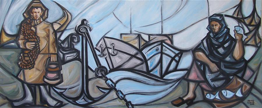 37 - Alegoria do Mar, 2005 - acrílico sobre platex - 183x76 cm.   38 - Pescador, 1999 - óleo sobre tela - 90x70 cm.   39 - Antes e depois, 1963 - óleo sobre tela - 138x53 cm.