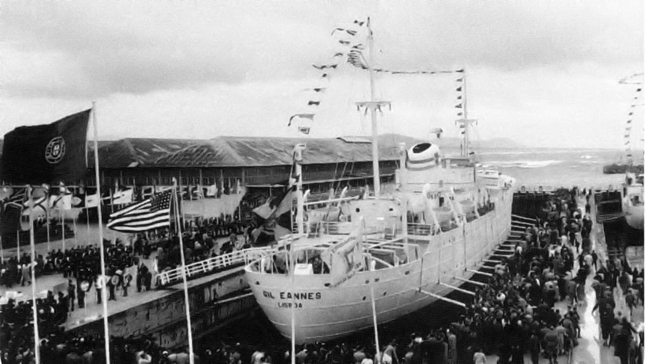 Cerimónia do lançamento à água do navio Gil Eannes nos estaleiros de Viana do Castelo, no dia 20 de Março de 1955.