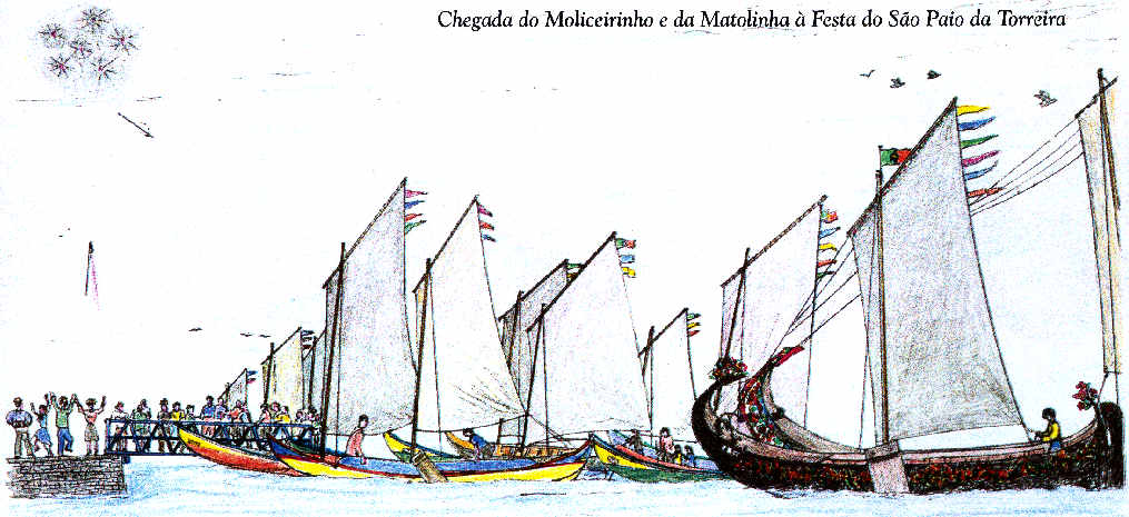 Quase se chocaram e, para espanto dos mestres-camaradas que os conduziam, foi amor à primeira vista! Encostaram-se um ao outro e, ainda que a água estivesse remansosa, sentiram cócegas ao roçarem-se. O Moliceirinho ficou tão contente que até parecia que dava saltos por cima da marola. Retesou a corda de bolinar e desatou numa tão louca velocidade que a Matolinha não o conseguia acompanhar. Como era muito mais leve que os moliceiros de trabalho, fazia-lhes desafios, passando-lhe tangentes pela frente, dava uma volta por detrás deles, mudava de escota e voltava a passar pela frente.