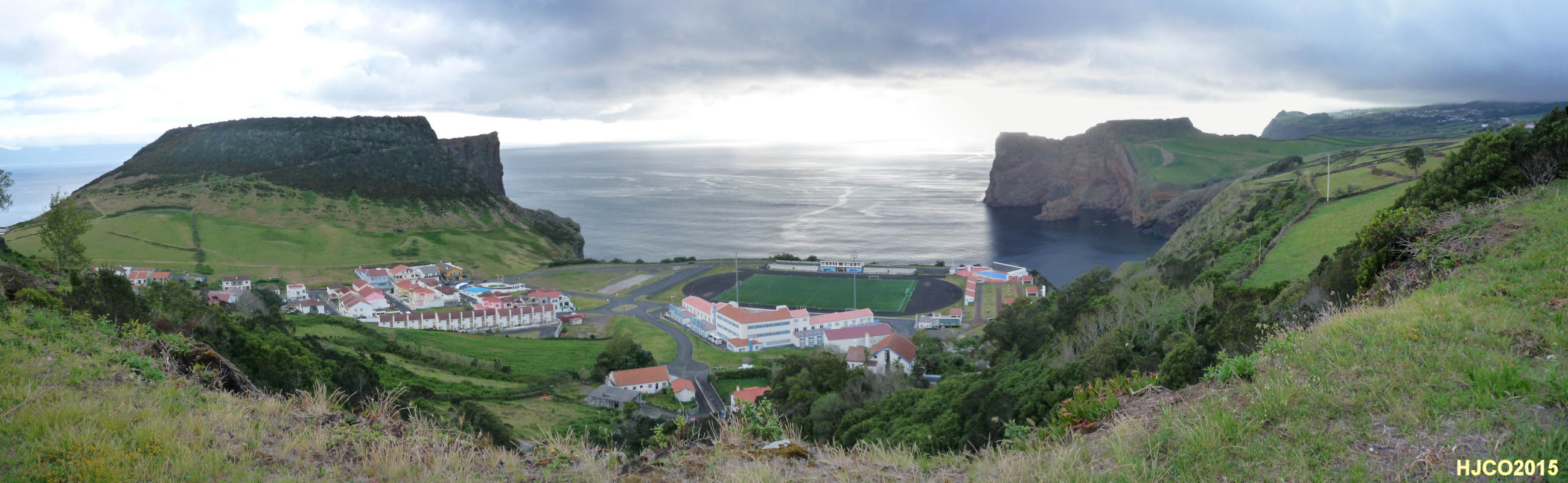 da costa na ilha de S. Jorge, nos Açores. Ao centro, complexo desportivo