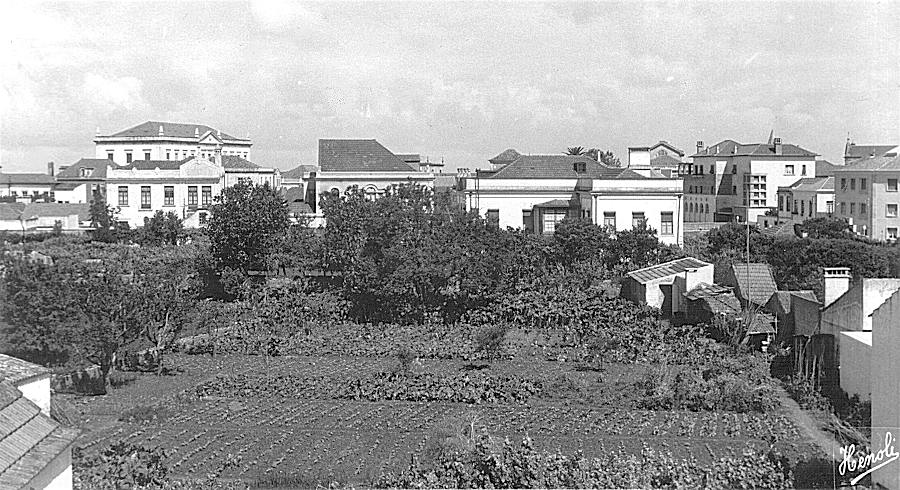 Aspecto da quinta dos Farelas, existente entre a rua Castro Matoso e ???. Ao fundo, vêem-se os edifícios do Governo Civil, à esquerda, e dos correios, à direita.
