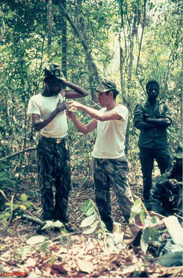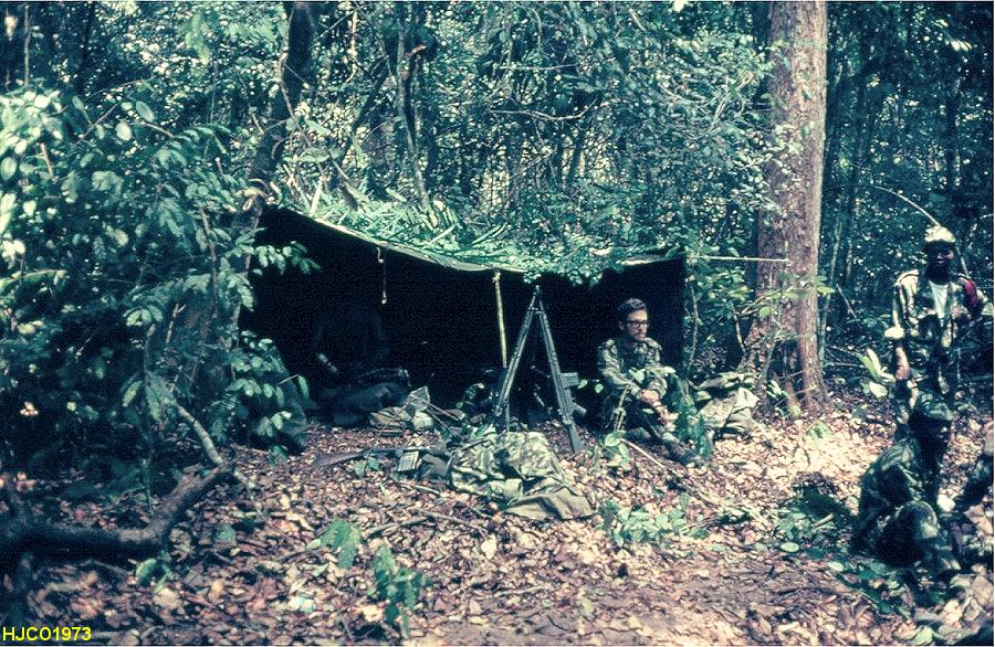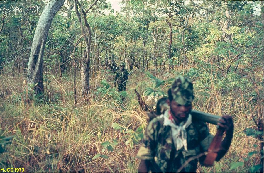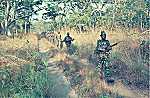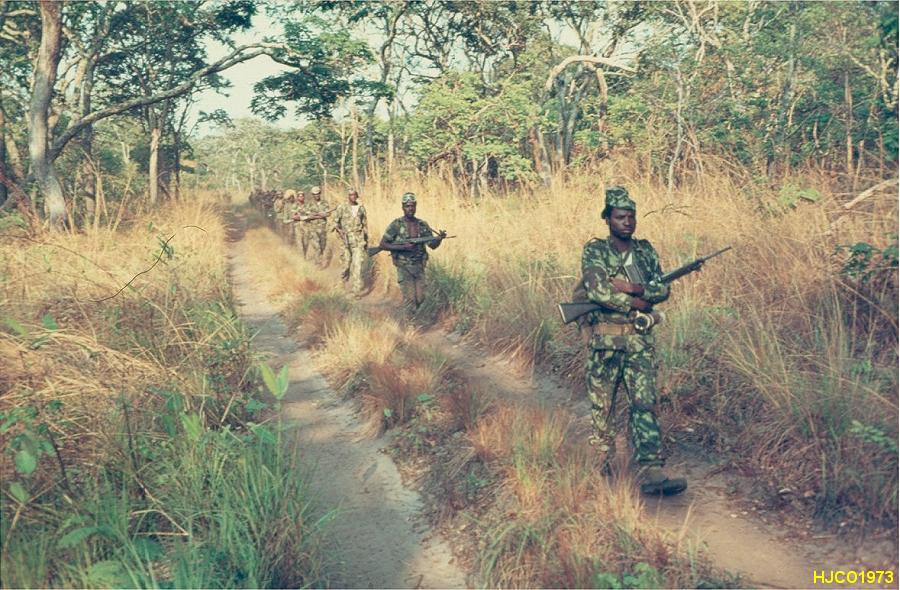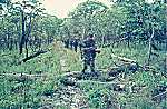 Numa zona de picada a caminho da Camuanga, no terceiro dia da operação «Explorar 8». (Slide refª 285). Na imagem, elementos do grupo GE 201, que operava quase sempre em conjunto com os elementos da 3ª Companhia do Bat. de Caçadores 4511.