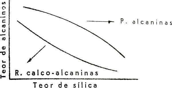 Numerosas análises puseram em evidência a existência de dois grupos fundamentais de rochas de origem magmática: no primeiro, dominam as alcalinas; o outro grupo é relativamente pobre em alcalinas, sendo a deficiência compensada pelo aumento do teor de cal. O primeiro grupo é o das rochas alcalinas; as segundas são calco-alcalinas.