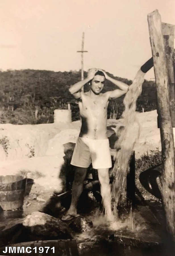 Jorge Manuel Machado Carvalho, da Companhia de Caçadores 3387, em Lué em 1971, no momento do banho. Ficheiro: 65_Lue