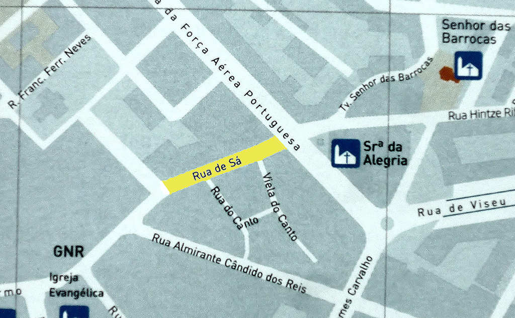 9. Será que o quarteirão a seguir aos semáforos, depois da Av. da Força Aérea e ao lado da capela da Senhora da Alegria, ainda é a Rua de Sá?  Procurámos em vão placas toponímicas que nos esclarecessem.