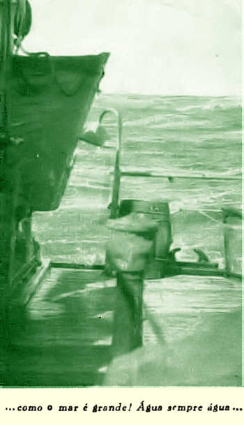 E começa a enorme viagem, ainda com uma ligeira paragem em Dakar, para abastecimento de combustível. Vinte dias a navegar... e como o mar é grande! Água, sempre água e calor, que nos persegue tenazmente, de noite e dia; na casa de máquinas, a temperatura sobe rapidamente. / 46 /