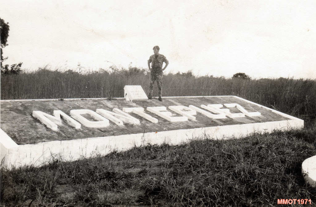 Base 29.ª da Companhia de Comandos, vendo-se na foto o autor da fotografia sobre a inscrição toponímica visível do ar, para facilidade de identificação pela força aérea.