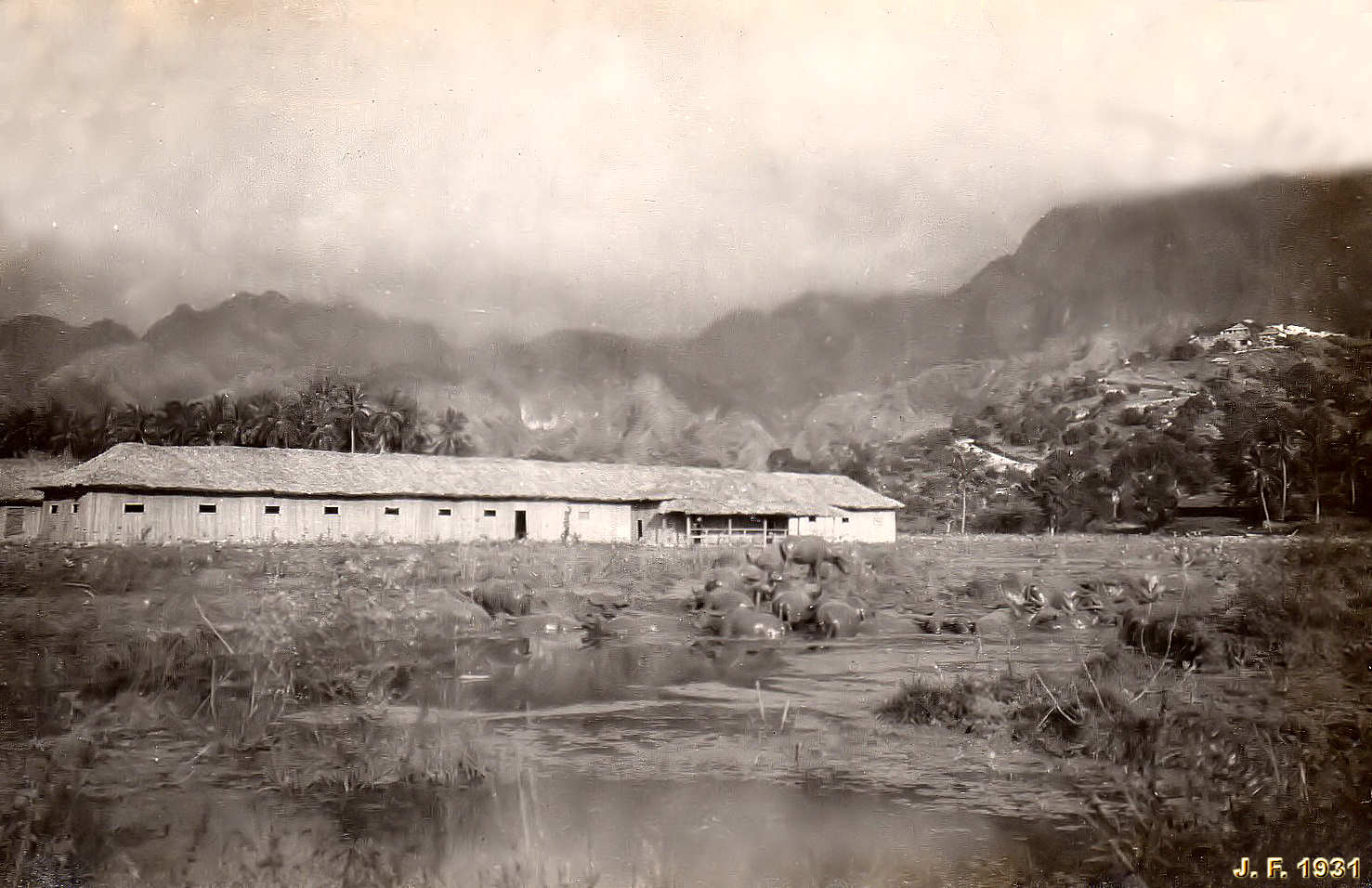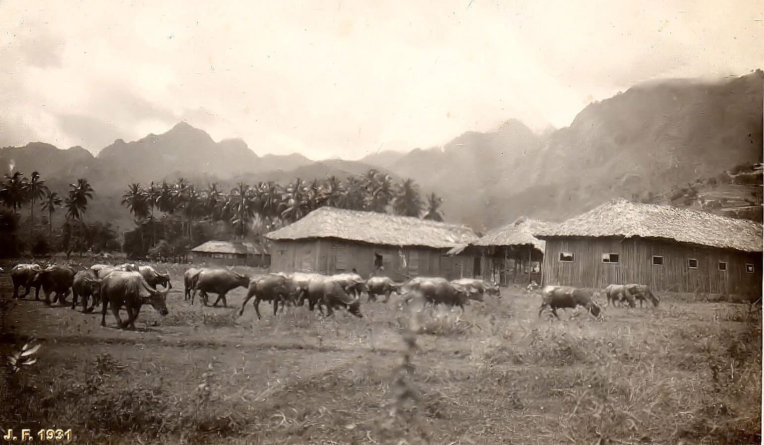 Campo de concentração de Oecussi. Fotografia registada no momento da passagem de uma manada de búfalos.