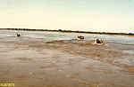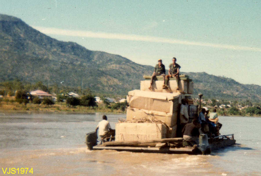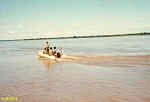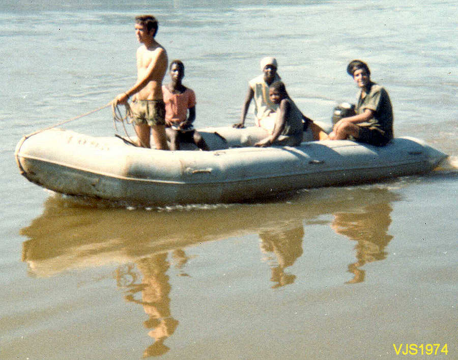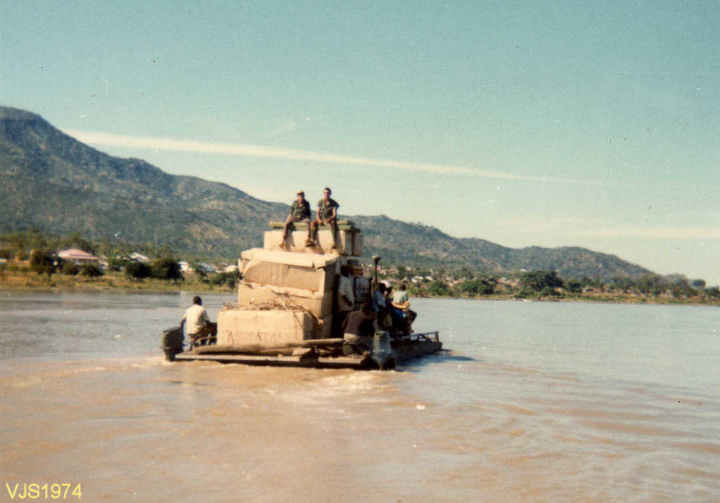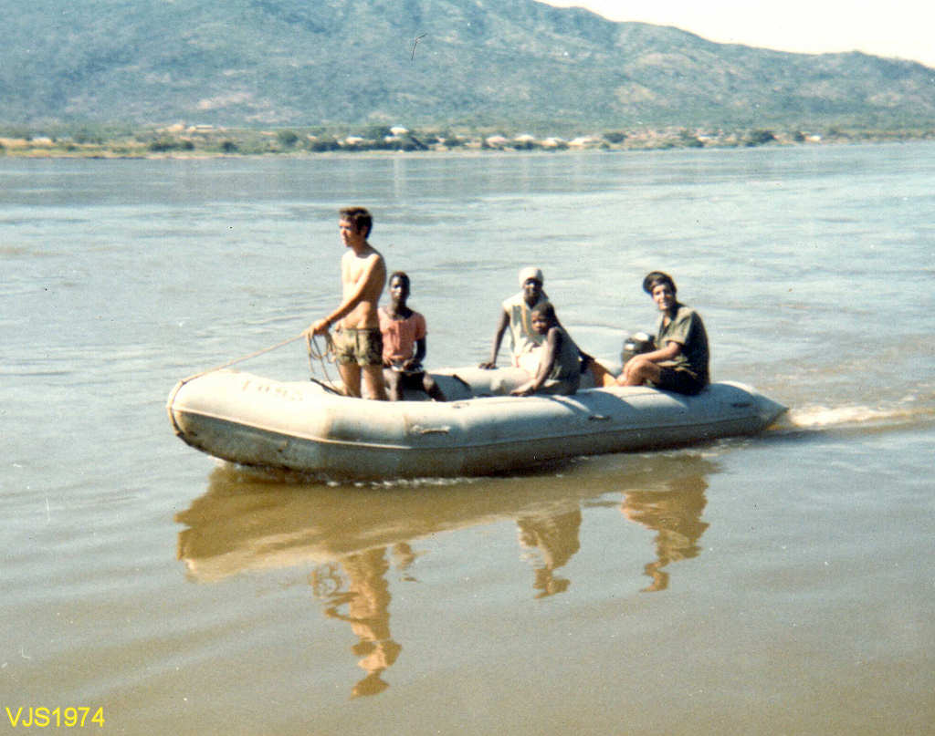 Jangada a atravessar o rio Zambeze. Da esquerda para a