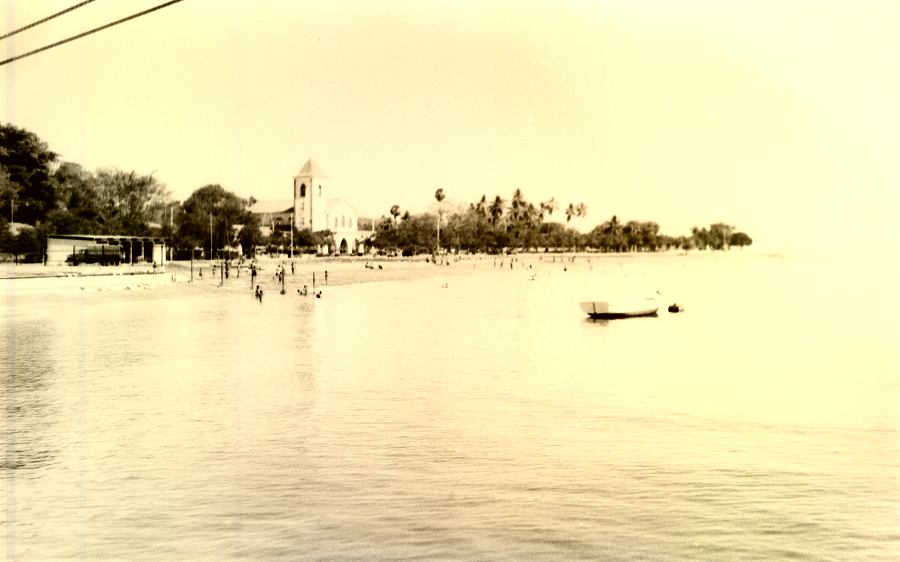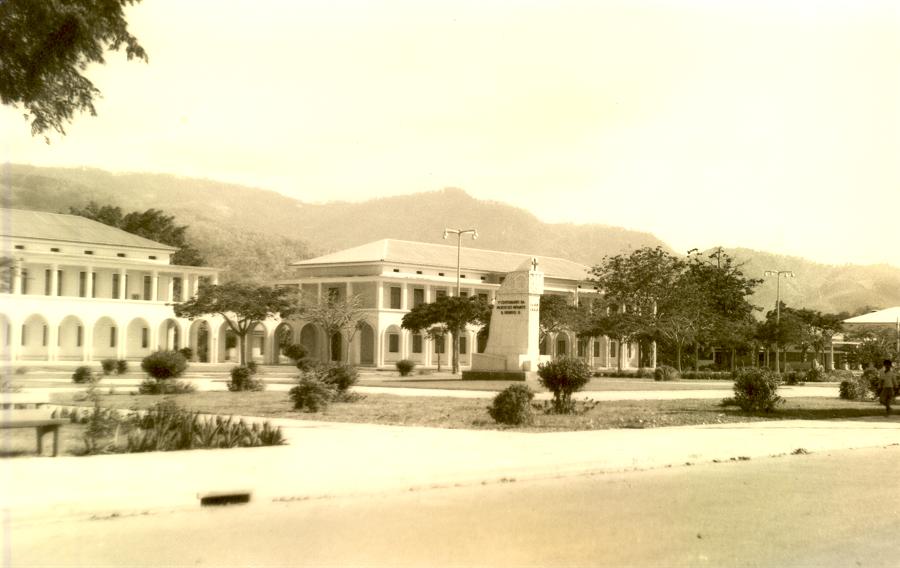 Palácio do Governo. À frente, o jardim da cidade de Dili com o monumento dedicado aos Descobrimentos e a D. Henrique.