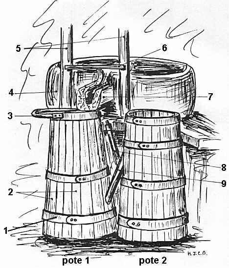 Figura 12: Potes do azeite e sertã para empilhamento das seiras a prensar. Lagar de Canelas de Baixo, concelho de Arouca. Legenda: 1-arco de ferro   2-aduelas   3-asa do pote   4-sertã   5-balaústes   6-travessa   7-bico da sertã    8-cano de esgoto   9-cano central.