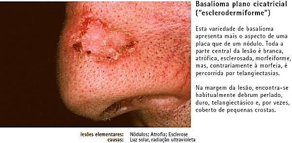 Lesão bem delimitada, telangiectasia. BASALIOMA - Nota: Os basaliomas podem assumir diversos aspectos, tais como nodulares, ulcus rodens, pigmentados, pagetoides, esclerodermiformes, etc. Ocorrem em zonas expostas à luz solar (cara, p. ex.).