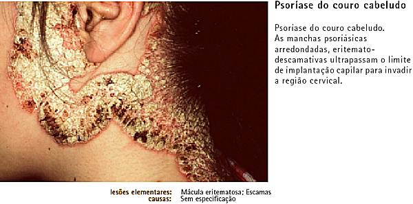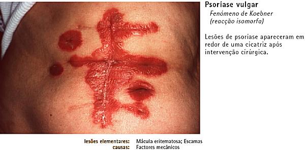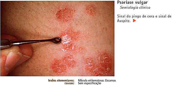 PSORÍASE VULGAR - Observações: A psoríase pode assumir diversos aspectos, tais como uma forma eritematosa, eritemato-descamativa, em placas, com aspecto de pingos de cera e sinal de Auspitz, em gotas de tamanhos variáveis, espalhadas pelo corpo, à volta de uma cicatriz, com pústulas (pustulosa), na forma de eritrodermia, isto é, generalizada por todo o corpo e sem zonas de pele sã, nas pregas, na zona das unhas, no couro cabeludo, na face, nas mucosas, inclusive no próprio pénis.