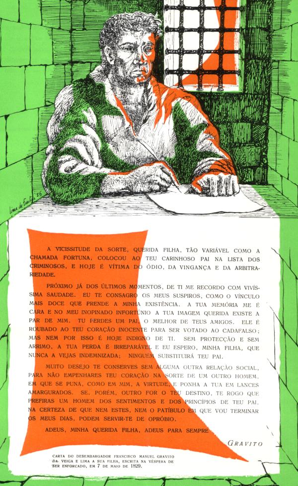 Sobre Gravito, que fora apenas uma espécie de conselheiro nos trabalhos preparatórios da Revolução, caiu — desconhecem-se ainda hoje as razões, se é que razões havia... — o ódio de Carlota Joaquina e, por tabela, o da Alçada... Havendo entrado nas cadeias em 10 de Agosto de 28,em 18 de Fevereiro seguinte concederam-se-Ihe cinco dias para dizer de facto e de direito. Por fim, a condenação à morte!